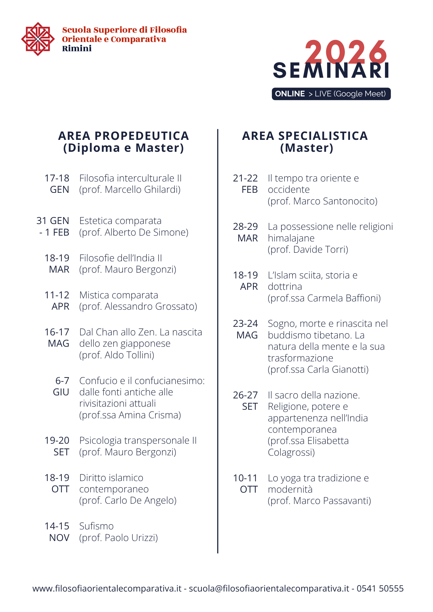 I seminari sono svolti da docenti universitari e studiosi accreditati e prestigiosi, i quali portano il contributo di competenze specifiche nel settore delle filosofie orientali e comparative.